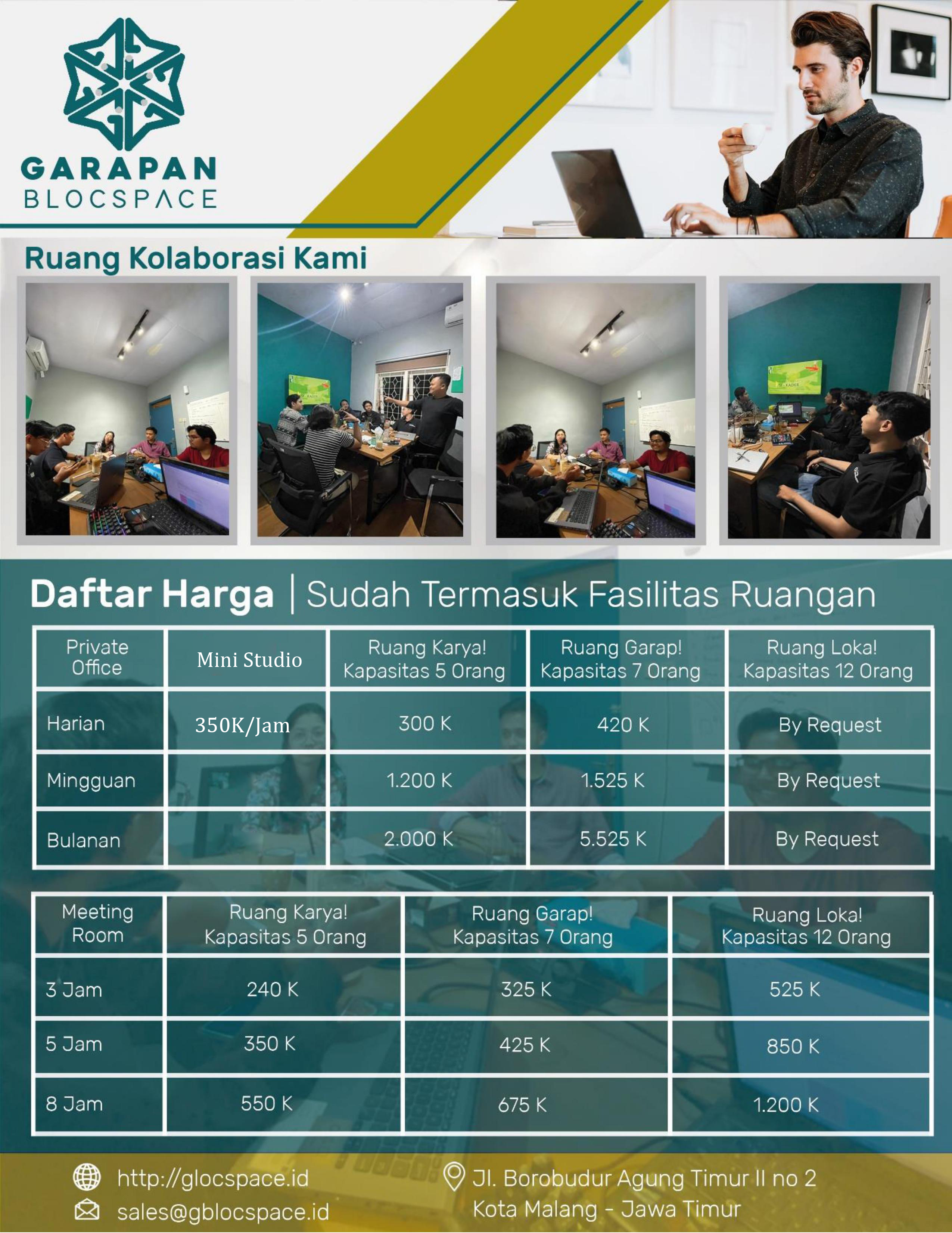 Dengan kombinasi fasilitas, fleksibilitas, dan atmosfer yang mendukung kreativitas, Garapan Blocspace adalah tempat yang sempurna untuk bekerja, berkolaborasi, dan mengembangkan bisnis di Kota Malang, Jawa Timur.